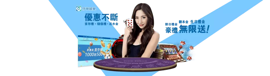 但是他們的優惠活動真的獨一無二,財神娛樂擁有菲律賓政府PAGCOR(菲律賓娛樂和遊戲公司)頒發的博彩牌照並經第三方遊戲平台GLI權威認證, 是一家合法,安全專業的博彩平台,財神娛樂的團隊已有12年的行業經驗,是值得您信任並放心遊戲的娛樂平台......